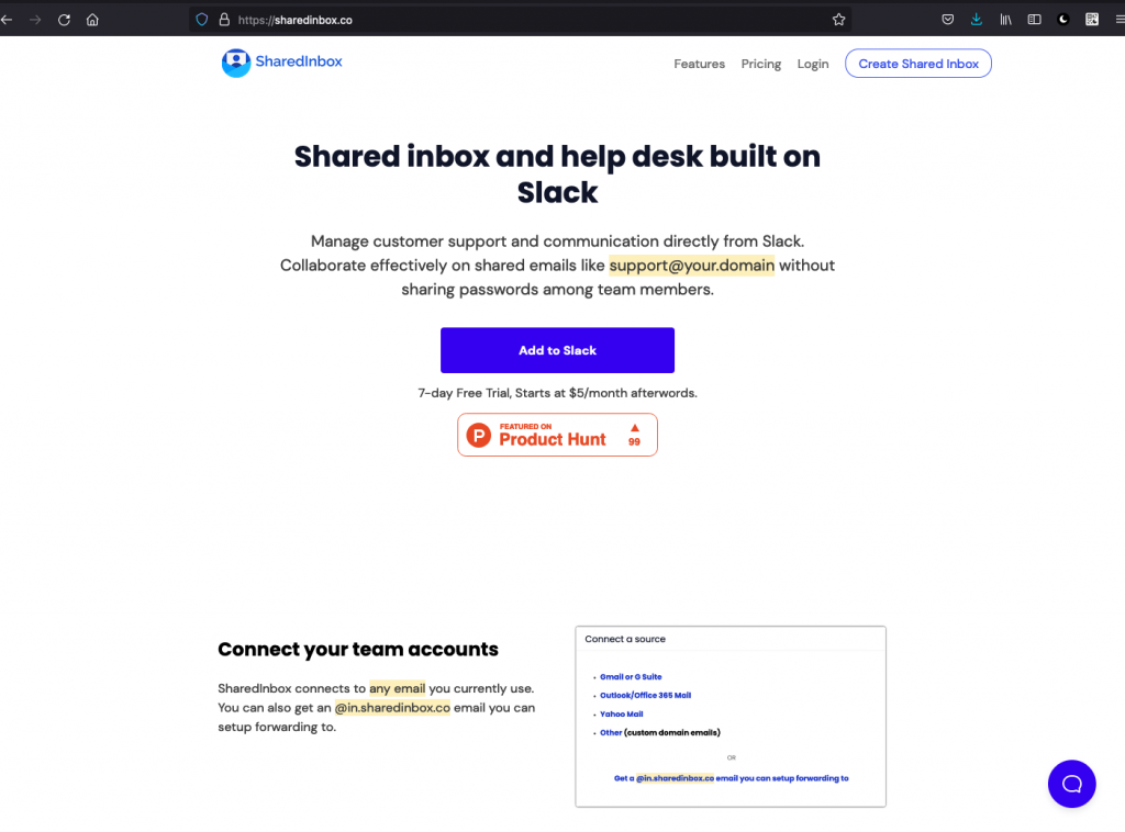 Sharedinbox allows businesses to manage customer support communications from within Slack. It also allows teams collaborate on shared emails without having to share passwords with everyone.